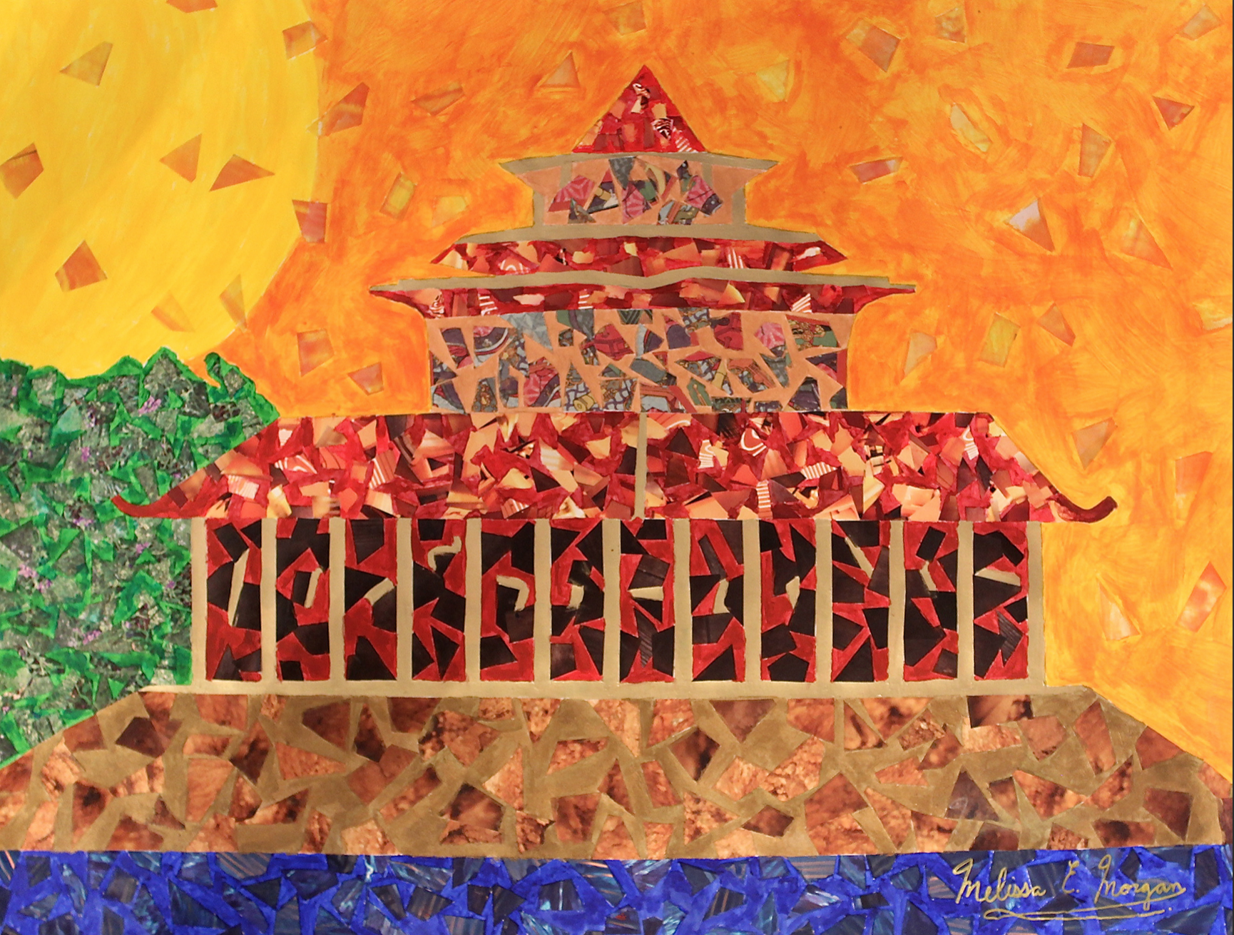 A collage/painting and interpretation of ancient Chinese architect near a large body of water with a blazing sun in the horizon. Over 700 pieces of magazine clippings were used for this particular artwork. To purchase the ORIGINAL, please email me directly to find out if this artwork is still available at WhizOfArt@gmail.com.